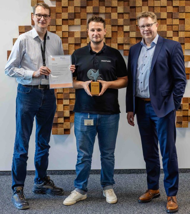 Bernd Höpner, Geschäftsführender Direktor (CTO) der MULTIVAC Group (im Bild ganz rechts) freut sich: «Die Auszeichnung bestärkt uns darin, unseren Einsatz für mehr Sicherheit und Ergonomie am Arbeitsplatz fortzusetzen und kontinuierlich nach neuen Möglichkeiten zur Verbesserung zu suchen.» David Walter, Teamleiter in der Montage von Tiefziehverpackungsmaschinen und Ideengeber für das neue Prüfsystem (Bildmitte) klärt auf: «Bei den Prüftätigkeiten für pneumatische Hubwerke bestand bisher nicht die Möglichkeit, diese in jede gewünschte Position zu fahren. Auch wurde die bisherige Bedieneinrichtung durch die unterwiesenen Mitarbeiter einhändig bedient. Da keine technische Lösung auf dem Markt verfügbar war, die unseren Anforderungen entsprach, entwickelte ein Projektteam aus den Bereichen Montage, Konstruktion, technischer Dokumentation und Arbeitssicherheit gemeinsam eine geeignete Lösung.» Links im Bild präsentiert Marc-Manuel Freitag von der Berufsgenossenschaft Holz und Metall (BGHM) die Auszeichnung. Der MULTIVAC Pneumatik-Prüfstand, der die internen Anforderungen vollumfänglich erfüllt, wurde auf Grundlage der aktuellen gesetzlichen Anforderungen und Normen konstruiert und einer CE-Konformitätsprüfung unterzogen. Er lässt sich bei MULTIVAC in vielen Montagebereichen zur Prüfung und zum Verfahren von pneumatischen Antrieben einsetzen. «Durch die engagierte Zusammenarbeit des Projektteams ist es uns gelungen, eine Lösung zu finden, die durch ihre erweiterten Möglichkeiten nicht nur eine einfachere Handhabung des Pneumatik-Prüfstandes, sondern auch grösstmögliche Sicherheit bietet“, resümierte Bernd Höpner.