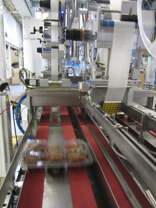 Ein wichtiger Bestandteil dieser Anlage ist der Case Packer, in dem das Gebäck verpackt, etikettiert und in Versandkartons geladen wird. Hier galt es, eine Lösung für die Etikettierung der Cookies in «Clamshell»-Verpackungen zu finden. Die Etiketten stellen sicher, dass die Verpackungen geschlossen bleiben. Da die Cookies keine weitere Umverpackung haben, spielt die optisch perfekte Positionierung der Etiketten ebenfalls eine grosse Rolle.
