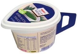 Eine interessante Verpackung mit klaren Convenience-Vorteilen für Konsumenten wurde in der Ausgabe 2006/Nr. 3 der Fachzeitschrift swisspack international beschrieben. Das für exklusive Markenprodukte der österreichischen Handelskette SPAR zum Einsatz kommende Sossenkännchen erfüllt mehrere Anforderungen auf einmal. Zu den Vorgaben des Erscheinungsbildes der neuen Packung, deren Inhalt regelmässig je nach Saison ändert, gehörte eine gute optische Eingliederung in das am Markt befindliche und sehr erfolgreiche SPAR Feine Küche Sortiment. Am POS kann die neue Saucen-Packung hängend oder stehend präsentiert werden. Neben der Einzigartigkeit der Funktion fällt das Produkt durch seine umgedrehte Tropfenform im Regal extrem auf. Die Verpackung bietet dem Konsumenten die notwendige Produktsicherheit und viel Convenience. Sie lässt sich einfach (ohne verspritzen des Inhaltes) öffnen, ist gut wiederverschliessbar und direkt als Sauciere (inkl. Griff) verwendbar. Der Inhalt wird also nach der Erwärmung ohne umfüllen direkt konsumiert. Die konische Form und das an Grenzen stossende Format der Kartonschleife stellen eine Besonderheit dieser Verpackung dar. Sie werden durch eine spezielle Verarbeitung und einen von der Offsetdruckerei Schwarzach selbst entwickelten Klebevorgang möglich. Dank einfachem Handling im manuellen Abpackverfahren wird eine hohe Stundenleistung erreicht. Der einklappbare, integrierte Griff auf der Kartonschleife garantiert die optimale Ausnutzung von Lager- und Transportraum. Der Kartonmantel der Offsetdruckerei Schwarzach umhüllt einen hitzebeständigen Polypropylen-Becher in eleganter Sauciere-Form. Die bei säntis packaging ag kreierte und produzierte Kunststoffschale mit wiederverschliessbarem Deckel wird beim SPAR-Zulieferbetrieb Malbuner Lebensmittel GmbH & Co, einem in Frastanz ansässigen Unternehmen der Ospelt-Gruppe abgefüllt. Die Verpackung ist tiefkühlfest und Mikrowellen-geeignet.