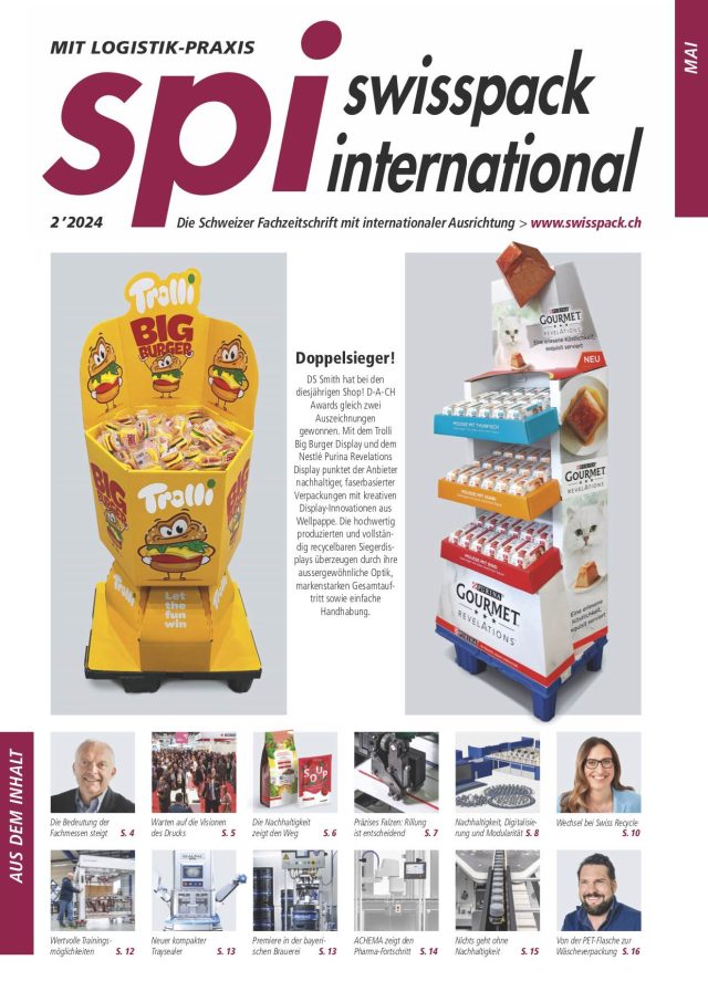 DS Smith hat bei den Shop! D-A-CH Awards 2024 gleich zwei Auszeichnungen gewonnen. Mit dem Trolli Big Burger Display (links im Bild) und dem Nestlé Purina Revelations Display (rechts) punktet der Anbieter nachhaltiger, faserbasierter Verpackungen mit kreativen Display-Innovationen aus Wellpappe. Die hochwertig produzierten und vollständig recycelbaren Siegerdisplays überzeugen durch ihre aussergewöhnliche Optik, markenstarken Gesamtauftritt sowie einfache Handhabung. Der Artikel «Doppelsieger!» erschien im Mai 2024 auf der Titelseite des Fachmagazins swisspack international (DS Smith Packaging Deutschland Stiftung & Co. KG).