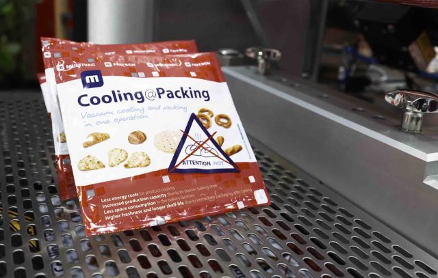 Beim Cooling@Packing-System handelt es sich um eine Vakuumtechnologie zur Kühlung von Backwaren, die den Abkühlprozess in eine Tiefziehverpackungsmaschine verlagert. Dadurch können Produkte unmittelbar nach dem Backen verpackt werden, was die Produkthaltbarkeit und Frische steigert. Durch den Einsatz von Cooling@Packing lassen sich Backwaren, wie Baguettes, Brote oder Kekse, direkt aus dem Ofen hygienegerecht mittels Einlegerobotern in die offenen Packungen der Beladestation einer Tiefziehverpackungsmaschine einsetzen. In der Maschine werden sie durch das Vakuumieren der Kammern innerhalb weniger Sekunden von etwa 95 °C auf rund 30 °C heruntergekühlt. Das spart Platz in der Produktion, senkt den Energieverbrauch bei der Kühlung und steigert dank kürzerer Backzeiten die Produktionskapazität. Die neue Lösung lässt sich in MULTIVAC Tiefziehverpackungsmaschinen für das Hochleistungssegment integrieren. In der Schweiz ist der Verpackungsmaschinen-Spezialist unter dem Namen MULTIVAC EXPORT AG bekannt.