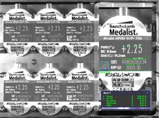 Für die Prüfung werden jeweils 10 Blister auf einem Palett präsentiert. Die Zykluszeit für die gesamte Prüfung darf maximal 2s betragen. Die Resultate der Inspektion müssen vom Visionsystem an die SPS kommuniziert werden. Als Vorgaben zur Inspektion werden Daten wie Stärke der Linsen (Dioptrien) vorgängig von der SPS an das Visionsystem kommuniziert. Die Anforderungen für eine Validierung nach den Standards der Pharmaindustrie werden vom System bereits standardmässig erfüllt. Die Illustration zeigt ein Kamerabild für die verschiedenen Prüfungen von 2D Datamatrixcode, OCV, Druckbildposition und Versiegelung.