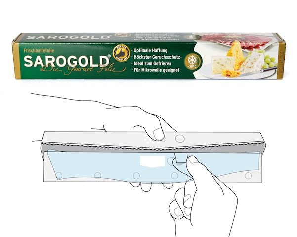 Die Sarogold-Haushaltsfolie bietet Aromaschutz und eignet sich zum Frischhalten, Tieffrieren und für die Mikrowelle. Die neue Box der Saropack AG garantiert sicheres und einfaches Handling in der Küche. Sie ist mit einem patentierten Abreissmesser versehen, welches nicht mehr gerade, sondern leicht V-förmig schneidet. Die Folie wird mit Hilfe einer speziellen Zahnung des Messers problemlos abgerissen. Eine aufklappbare Kartonlasche vereinfacht das Nachfassen der Folie. Eine kleine Folieneinlage verhindert das Rückrutschen der Folie. Die Box ist mit zwei kleinen seitlichen Führungen versehen, welche das Herausspringen der Rolle verhindern.