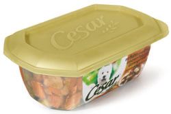 Seit Juni 2007 sticht in den Hundefutter-Regalen des europäischen Handels unter den zahlreichen Alu-Verpackungen eine exklusive Lösung aus Kunststoff heraus. Es handelt sich um die neu lancierte Multi Menu-Produktelinie der Marke Cesar aus dem Haus Mars Petcare. Sie bietet durch ein transparentes Sichtfenster Einblick in den delikaten Inhalt und ist mit einem wiederverschliessbaren Deckel ausgestattet. Mit diesen beiden Features präsentiert die neue Produktelinie höchste Convenience in der portionierten Fütterung von Kleinhunden. Nach diesem Motto entstand die von höchster Transparenz. Der Inhalt, saftig-zartes Fleisch mit schonend gegartem Gemüse und Getreide in sechs Sorten, bleibt auch nach dem Öffnen appetitlich frisch. Die hitze- und mikrowellenbeständige PP-Schale mit 280 Gramm Inhalt bietet höchste Barriere-Eigenschaften für maximales Shelf-Life. Das Marketing von Mars Petcare hat das innovative Verpackungskonzept entwickelt, die Verpackungsprofis von säntis packaging ag haben es technisch perfekt umgesetzt. Im intensiven Dialog fiel auch der Entscheid, die Schale nicht zu etikettieren, sondern mit einem 8-farbigen Sleeve mit Sichtfenster zu dekorieren. Das dreifache Branding auf dem Sleeve, der Frischhaltefolie und dem goldfarbenen Wiederverschliess-Deckel setzt dem Verpackungskonzept die verkaufsfördernde Krone auf.