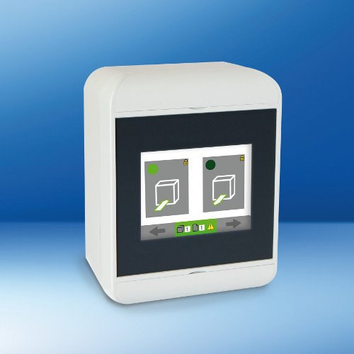 Der Datenaustausch erfolgt über CAN-Bus. Auf dem 3,5“ LC-Grafikdisplay wird die Anwendung dargestellt, Parameter sowie Prozessdaten lassen sich einfach eingeben und ändern. Das Bediengerät mit Abmessungen von 11 x 15,7 x 5,9 cm (B x H x T) kann direkt an der Maschine angebracht werden, da es IP54-geschützt ist (Kunststoffgehäuse). Mit LASAL steht ein durchgängiges und vollintegriertes Engineering Tool für die Programmierung und Visualisierung der Funktionalitäten zur Verfügung.