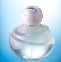 kleine Fläschchen Kugelformen. Damit gelang es, die Idee der Blume und ihres Tanzes in eine eigenwillige Abstraktion zu übersetzen. Wie sich entfaltende Blätter einer Knospe verschachtelten die Glaskünstler der belgischen Gerresheimer-Tochtergesellschaft Momignies drei Kugeln zu einem sagenhaft leichten, lebendigen Objekt – die genial tarierte Konstruktion verleiht der gläsernen ‚Dancing Lady‘ unverkennbaren Swing. Genau gesagt sind es zwei ineinandergelegte Kugelschalen, die eine dritte, scheinbar komplette Kugel umfangen. Erst eine Asymmetrie bringt optische Bewegung in diesen Aufbau: Die Schalen neigen sich in unterschiedlichen Winkeln und Richtungen – aus der Mitte wächst die kleinste Kugelform als makelloses Rund. Um das bewegte Bild zu vollenden, legten die Designer einen Hauch von Weiss auf das klare Glas – in Degradee-Besprühung, die nach unten hin allmählich in schwereloser Transparenz verschwindet. Besondere Akzente setzt dazu der Verschluss: In knackigem Lila-Metallic blitzt der Sprühkopf aus einer blütenweissen Manschette, die gleichfalls wie eine mehrschichtige Knospe erscheint – im Gleichklang mit dem Glas swingend, nur en miniature.