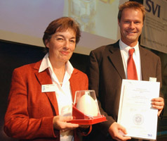 Die Entwicklung «Sika Mix & Go Kit» ist Verpackung, Mischanlage und Arbeitsgefäss in einem. Nachdem die Innovation einen Swiss-Star und einen Worldstar 2004 gewonnen hatte, konnte Wipf AG Ende Mai 2005 in Sao Paulo mit President’s Award auch die höchste Verpackungsauszeichnung des Jahres entgegen nehmen; diesen Preis, der jährlich nur einer einzigen Verpackung zuteil wird, hat das Unternehmen früher bereits einmal, im Jahr 2000 nämlich, für sein Dream- Steam-System gewonnen. Das Bild zeigt Judith Schlegel und Thomas Good von Wipf AG anlässlich der Swiss-Star-Preisverleihung. Der von Wipf hergestellte und von Sika International verwendete Standbeutel enthält 1,25 kg trockenen Mörtel. Zum Mischen wird der Drehverschluss