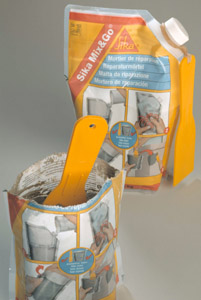 geöffnet, die Erstöffnungsmembrane entfernt und 2 dl Wasser eingefüllt. Anschliessend wird die Luft leicht aus dem Beutel herausgepresst und dieser mit dem Schraubverschluss wieder fest verschlossen. Durch Kneten und Schütteln werden Mörtel und Wasser vermischt, bis sich eine homogene Masse bildet. Indem der obere Teil des Beutels entlang einer Laserperforation weggerissen und der Boden aufgespreizt wird, entsteht ein Becher mit gebrauchsbereitem Mörtel. Ein mitgelieferter Spatel erleichtert die Anwendung. Eine Seite des Beutels enthält einen bildlich dargestellten Anwendungskurzbeschrieb, während auf der transparenten Rückseite eine viersprachige, detaillierte Gebrauchsanweisung angebracht ist; diese bleibt auf dem Mischbehälter erhalten.