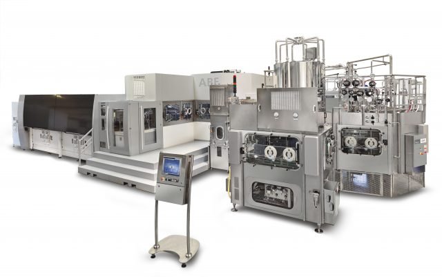 Das aseptische Blasverfahren senkt den Einsatz von Chemikalien ebenso wie den Energieverbrauch im Sterilisationsprozess. Messeneuheit war GEA Sterilfoil VHP L, ein flexibles System zur Foliensterilisation, das sich für eine breite Palette an Abfüllverfahren wie die Ultrahocherhitzung eignet. Beide Technologien erreichen durch die Behandlung mit kondensierendem Wasserstoffperoxid H2O2 eine maximale Dekontaminationseffizienz (bis zu 6 log) für Flaschen und Folien bei sowohl stark säurehaltigen als auch säurearmen Getränken. Abgebildet ist die GEA ABF als ein integriertes aseptisches Füll- und Verschliesssystem für die Verarbeitung von stark säurehaltigen ebenso wie säurearmen Getränken.